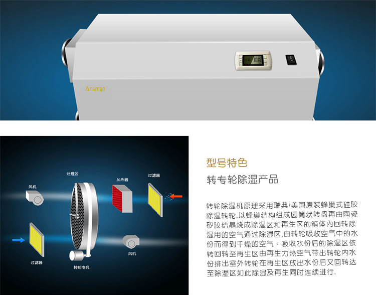 安詩曼是專業(yè)轉(zhuǎn)輪除濕機(jī)生產(chǎn)廠家,主要產(chǎn)品有工業(yè)除濕機(jī),高溫烘干機(jī),轉(zhuǎn)輪除濕機(jī),低溫除濕機(jī),吊頂除濕機(jī),商用抽濕機(jī),商用除濕機(jī),工業(yè)抽濕機(jī),工業(yè)干燥機(jī)等產(chǎn)品